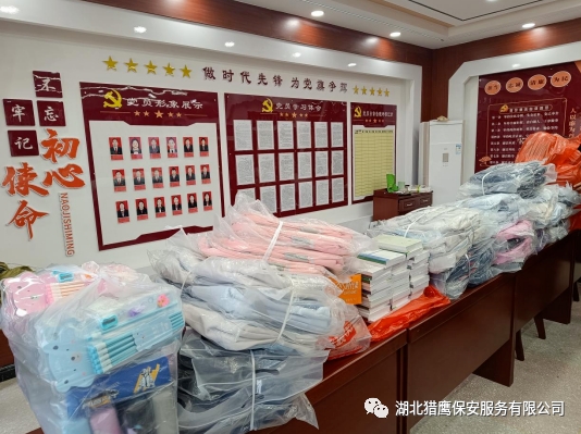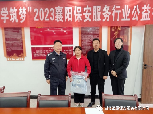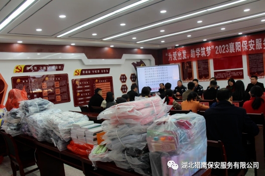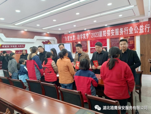 2023年11月24日在襄陽市公安局保安監(jiān)管大隊的帶領(lǐng)下,湖北獵鷹保安服務有限公司聯(lián)合襄陽其他保安服務行業(yè)一行7個單位走進保康縣店埡鎮(zhèn)兩所學校,為貧困學生送去了資助金和一批書籍、文具、書包等物資。